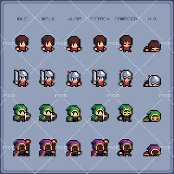 actions: 6 - idle, walk, jump, attack, damaged and K.O.